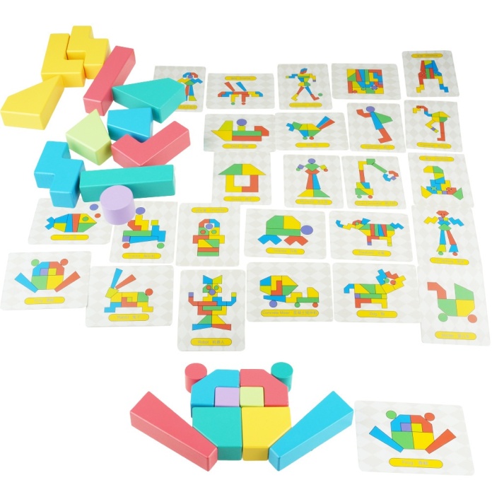 Drewniana kolorowa układanka, mozaika, tangram to idealna zabawka dla dzieci. Zadaniem malucha jest ułożenie odpowiednich elementów pokazanych na kartach. Całość tworzy różne postacie.