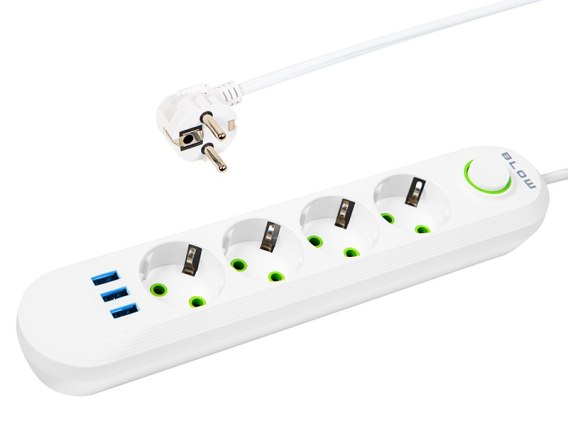 Przedłużacz sieciowy BLOW w kolorze białym z czterema gniazdami przeznaczony do użytku domowego. Przedłużacz pozwala podłączyć urządzenia, ktre są oddalone od gniazda elektrycznego. Produkt z jednej strony posiada 4 gniazda obrcone pod kątem oraz włącznik, a z drugiej pojedynczy kątowy wtyk sieciowy.